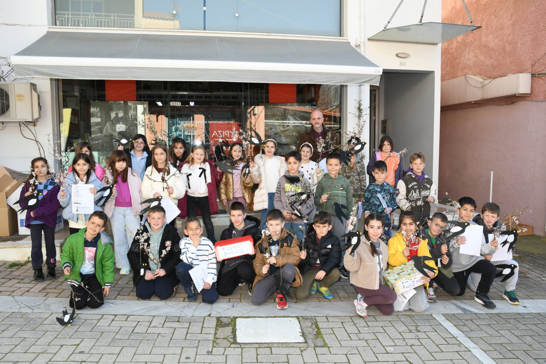 Μ’ αυτά τα κάλαντα, παιδιά της Γ΄ τάξης του 2ου Δημοτικού Σχολείου Αγιάς, υπό την καθοδήγηση των εκπαιδευτικών, Σοφίας Σοφολόγη – Μπαλταγιάννη, Ανδρέα Μαλαχτάρη και Μαρίας Στάικου, γυρίζοντας σε καταστήματα και υπηρεσίες στο εμπορικό κέντρο της Αγιάς και κρατώντας στα χέρια τους ομοιώματα χελιδονιών, χάρτινα λουλουδάκια που τα ίδια έφτιαξαν, και ανθισμένα κλαδιά αμυγδαλιάς, αναβίωσαν τα «Χελιδονίσματα», ένα πρωτομαρτιάτικο έθιμο που αποτελεί το μελωδικό καλωσόρισμα της Άνοιξης και οι ρίζες του φτάνει στην αρχαία Ελλάδα.