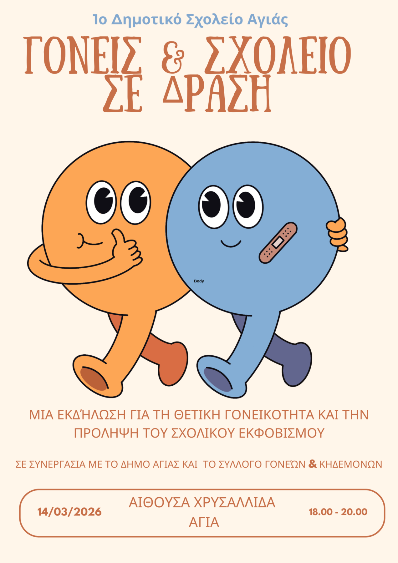 Με αφορμή την Πανελλήνια Σχολική Ημέρα κατά της Βίας στο Σχολείο, ο Σύλλογος Διδασκόντων και Διδασκουσών του 1ου Δημοτικού Σχολείου Αγιάς απευθύνει ανοιχτή πρόσκληση στην εκδήλωση «Γονείς και Σχολείο σε Δράση», το Σάββατο 14 Μαρτίου, στις 18.00, στο Πολιτιστικό Κέντρο Αγιάς “Χρυσαλλίδα”, την οποία διοργανώνει σε συνεργασία με τον Δήμο Αγιάς και τον Σύλλογο Γονέων και Κηδεμόνων του σχολείου και έχει στόχο την ενημέρωση των γονέων και κηδεμόνων σχετικά με τις ενέργειες του σχολείου για την πρόληψη φαινομένων ενδοσχολικής βίας και εκφοβισμού, καθώς και τον ρόλο που μπορούν να έχουν οι γονείς και η ευρύτερη κοινότητα για την πρόληψη τέτοιων φαινομένων.