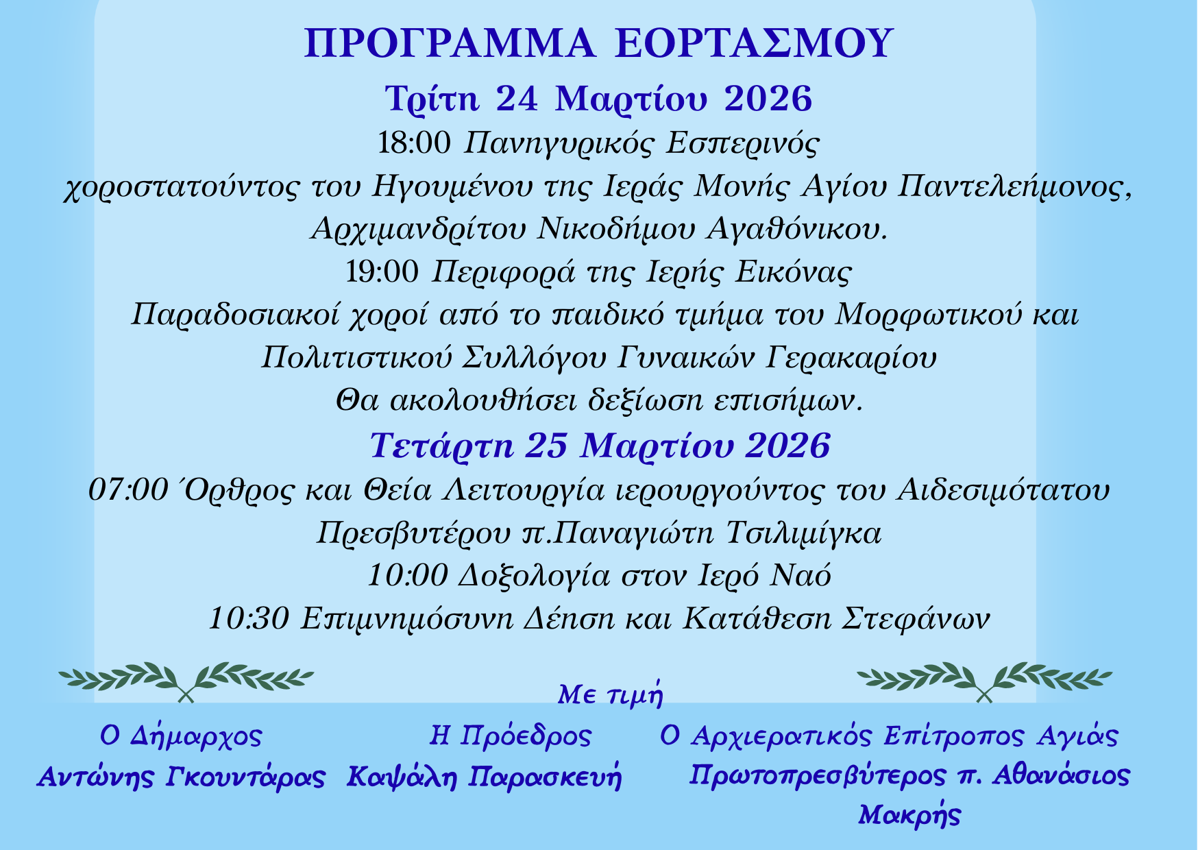 Το πρωί της Τετάρτης 25 Μαρτίου, στις 7:00, θα τελεσθούν ο όρθρος και η πανηγυρική θεία λειτουργία, στις 10:00 η δοξολογία από τον ιερέα π. Παναγιώτη Τσιλιμίγκα, και στις 10:30 επιμνημόσυνη δέηση και κατάθεση στεφάνων στο Ηρώο των Πεσόντων.