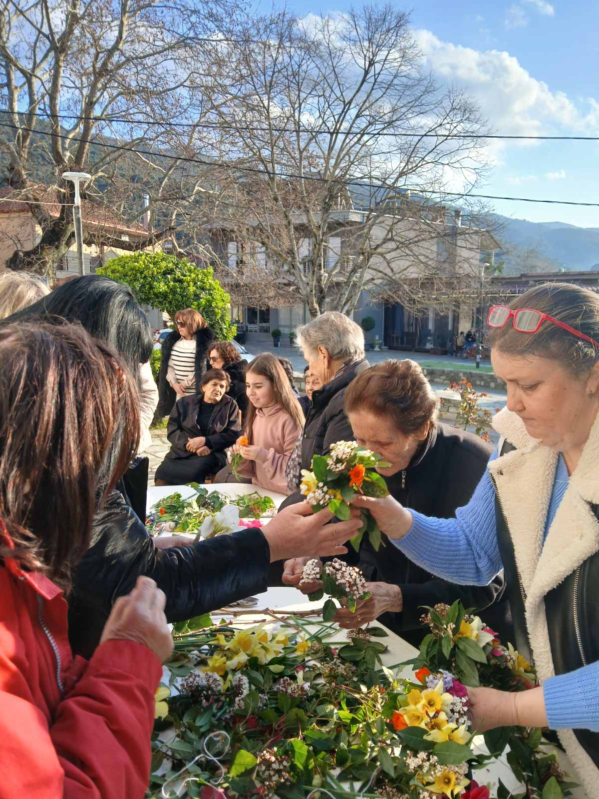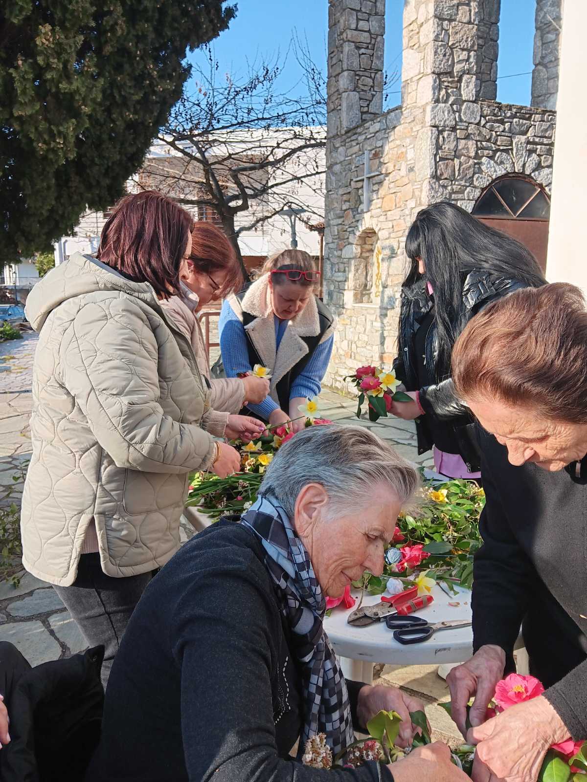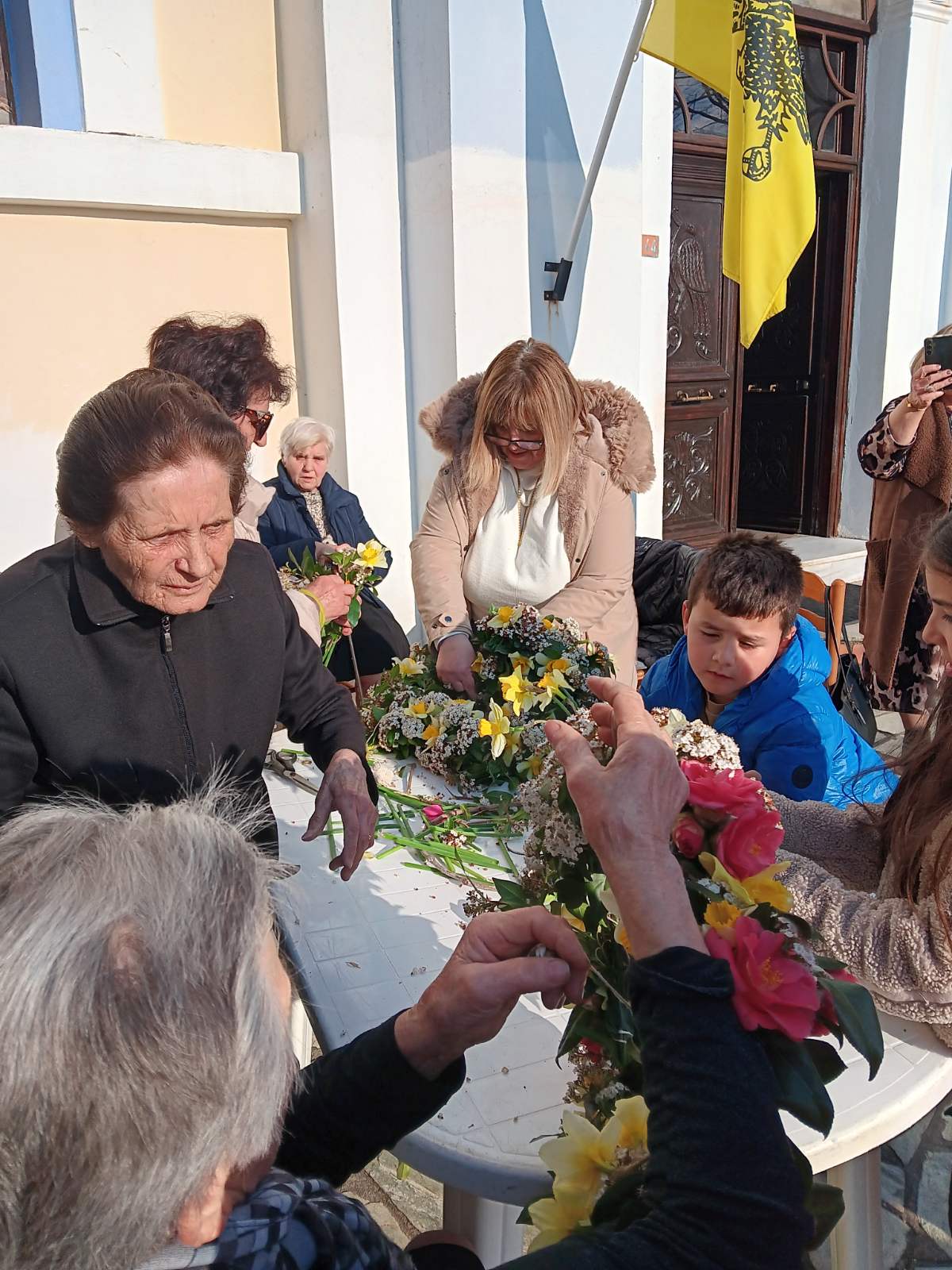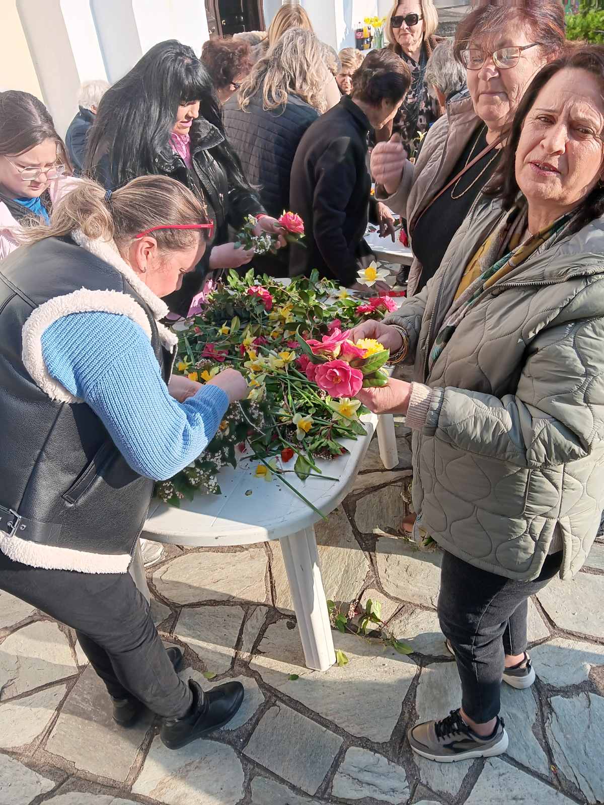 Αφού πρώτα μάζεψαν από το Μαυροβούνι, στους πρόποδες του οποίου βρίσκεται το χωριό, εκατοντάδες λουλούδια, γυναίκες κάθε ηλικίας συγκεντρώθηκαν στην πλατεία και έφτιαξαν μ’ αυτά τέσσερις Σταυρούς, έναν για κάθε εκκλησία της ενορίας τους, χρησιμοποιώντας απλά βέργες και νήμα.
