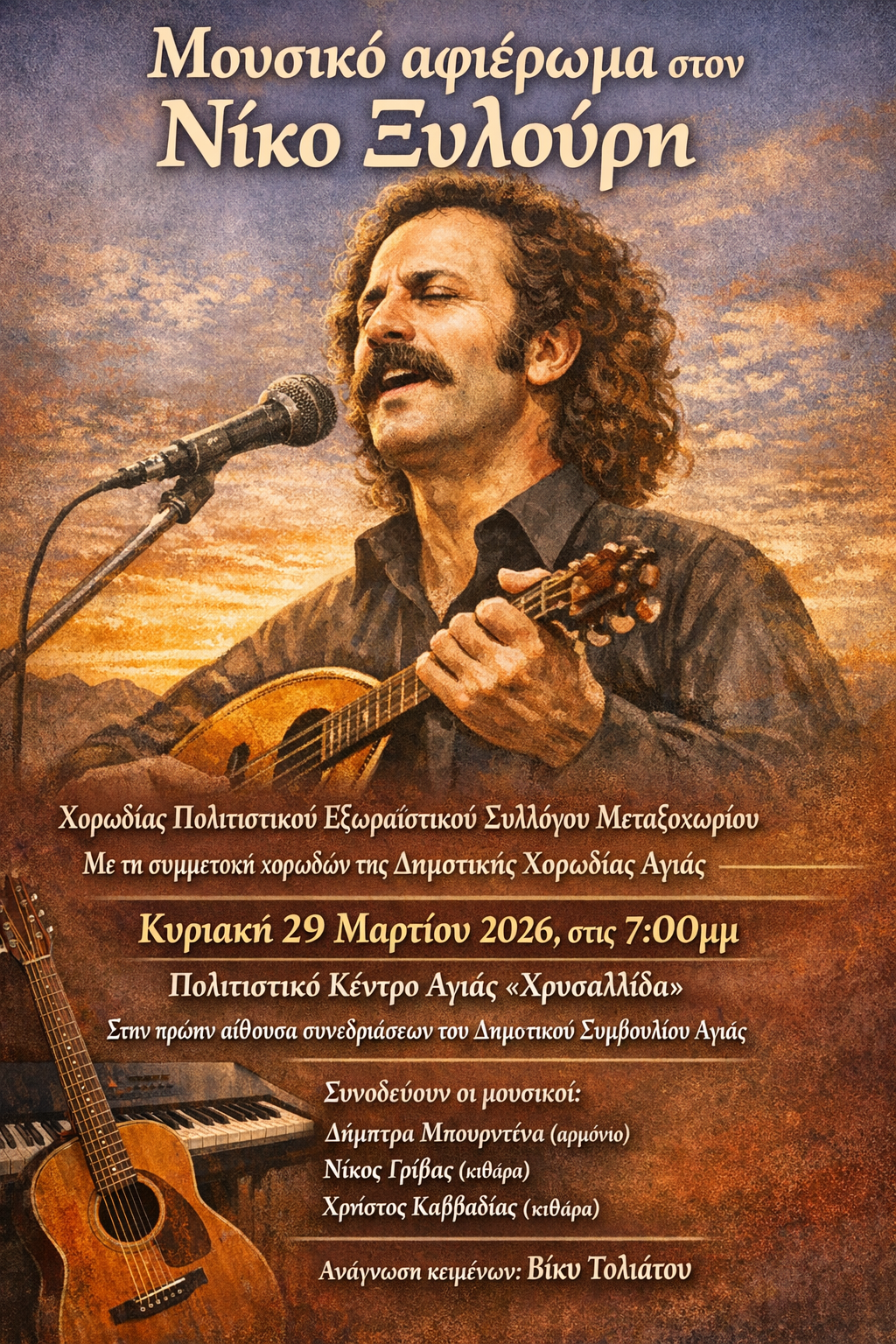 Μουσικό αφιέρωμα στον Νίκο Ξυλούρη διοργανώνει η Χορωδία του Πολιτιστικού Εξωραϊστικού Συλλόγου Μεταξοχωρίου με τη συμμετοχή χορωδών της Δημοτικής Χορωδίας Αγιάς, την Κυριακή 29 Μαρτίου, στις 7:00μμ, στο Πολιτιστικό Κέντρο Αγιάς «Χρυσαλλίδα» (στην πρώην αίθουσα συνεδριάσεων του Δημοτικού Συμβουλίου Αγιάς), με ελεύθερη είσοδο για το κοινό.