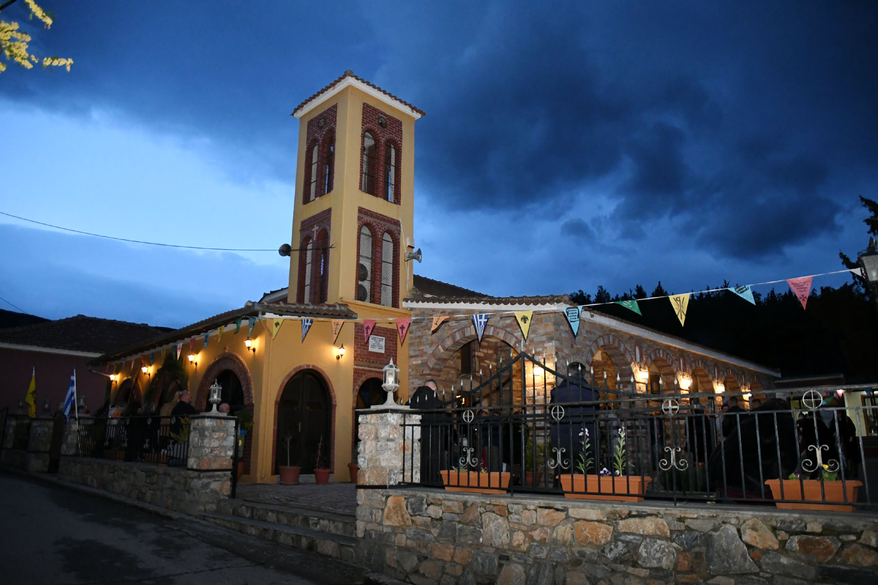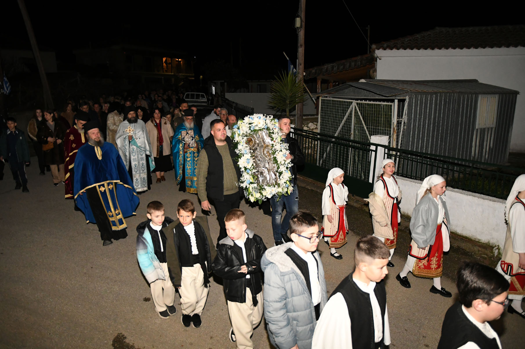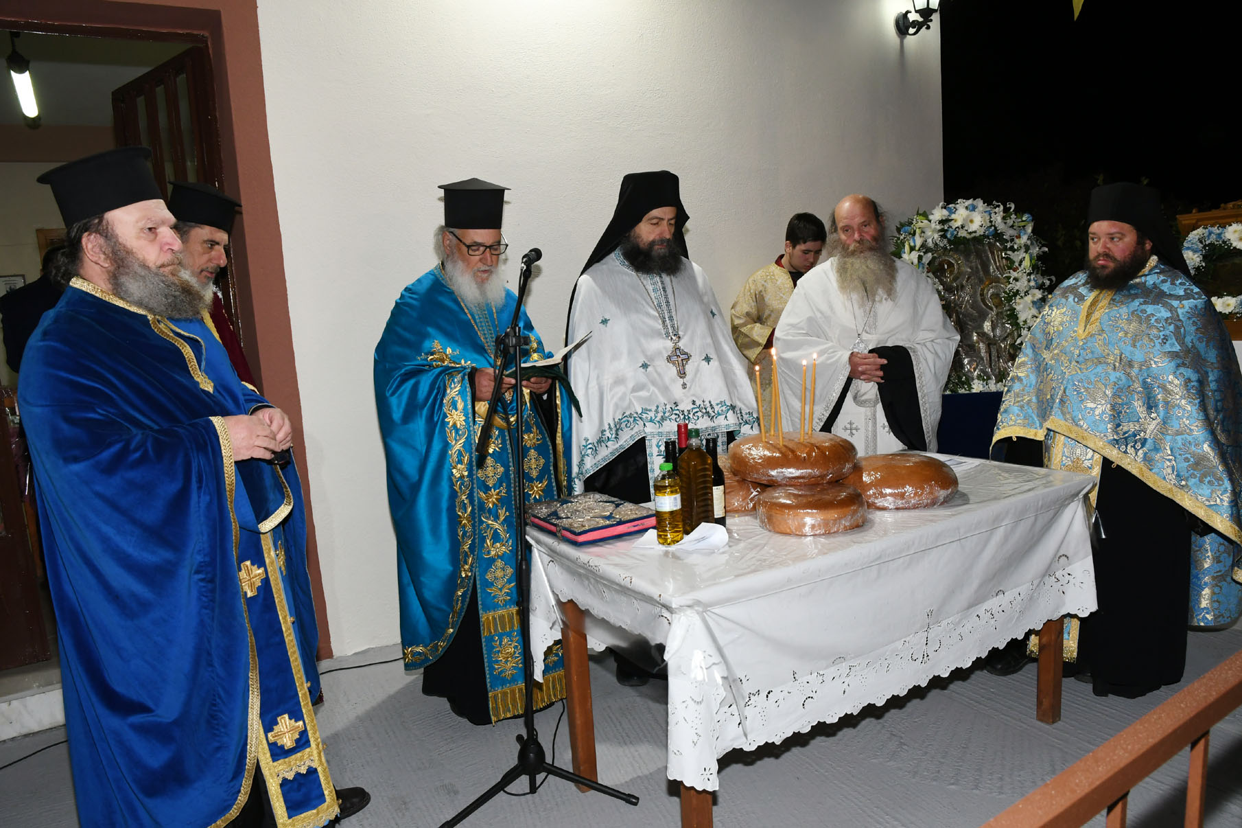 Παρουσία πολλών πιστών, στον ομώνυμο ναό τελέσθηκε μέγας πανηγυρικός εσπερινός μετά αρτοκλασίας από τον αρχιερατικό επίτροπο Περιφέρειας Αγιάς, πρωτοπρεσβύτερο π. Αθανάσιο Μακρή, τον ηγούμενο της Ιεράς Μονής Αγίου Παντελεήμονος Αγιάς, αρχιμανδρίτη Νικόδημο Αγαθονίκου, τον εφημέριο π. Παναγιώτη Τσιλιμίγκα και άλλους ιερείς. Στους κεντρικούς δρόμους του χωριού πραγματοποιήθηκε λιτάνευση της ιεράς εικόνας της Ευαγγελίστριας.