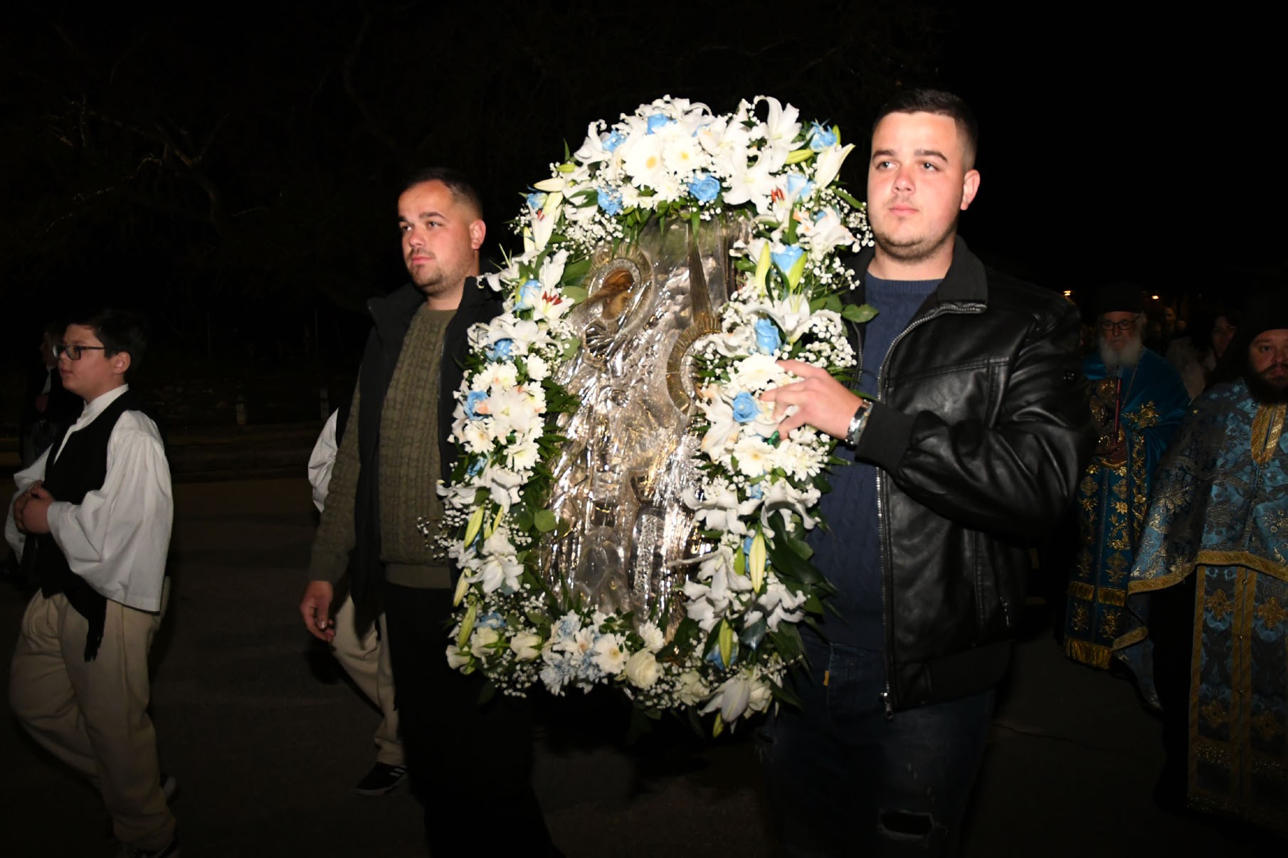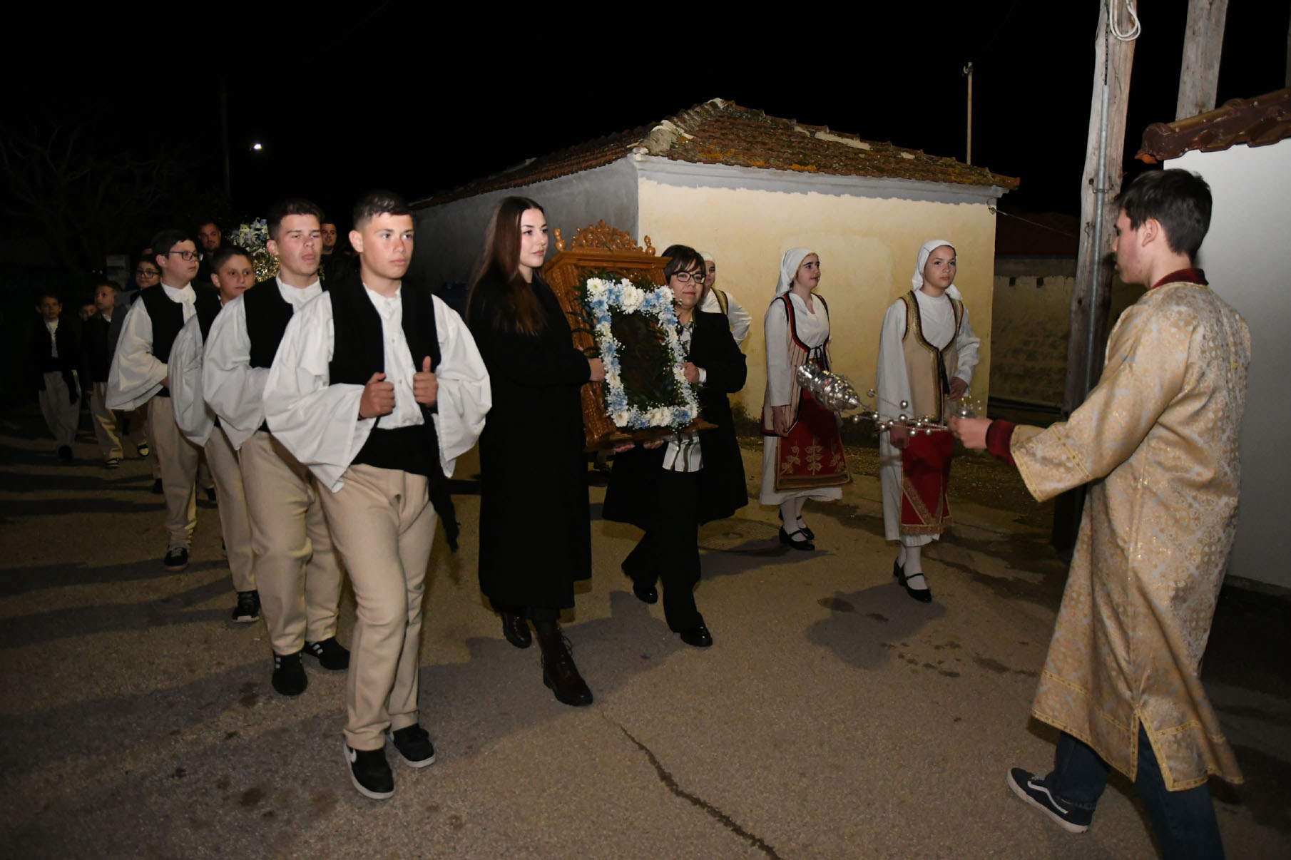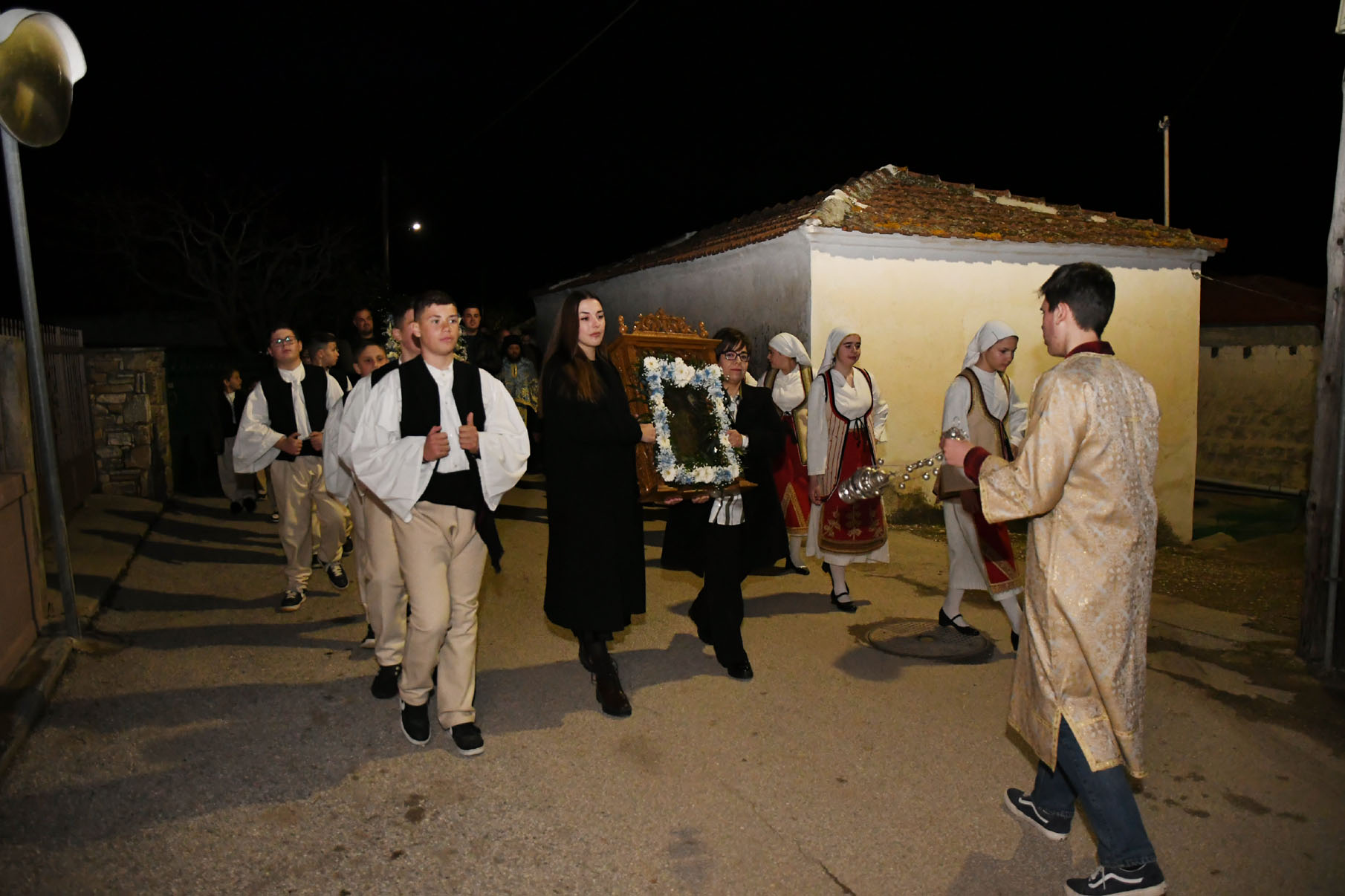 Παρουσία πολλών πιστών, στον ομώνυμο ναό τελέσθηκε μέγας πανηγυρικός εσπερινός μετά αρτοκλασίας από τον αρχιερατικό επίτροπο Περιφέρειας Αγιάς, πρωτοπρεσβύτερο π. Αθανάσιο Μακρή, τον ηγούμενο της Ιεράς Μονής Αγίου Παντελεήμονος Αγιάς, αρχιμανδρίτη Νικόδημο Αγαθονίκου, τον εφημέριο π. Παναγιώτη Τσιλιμίγκα και άλλους ιερείς. Στους κεντρικούς δρόμους του χωριού πραγματοποιήθηκε λιτάνευση της ιεράς εικόνας της Ευαγγελίστριας.