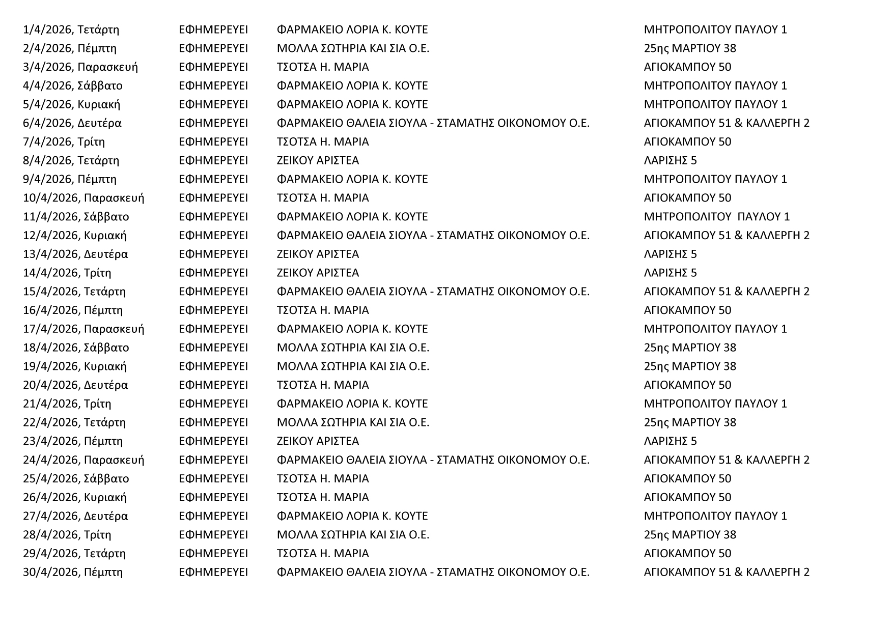 Οι εφημερίες των φαρμακείων της Αγιάς ως 30 Απριλίου 2026: