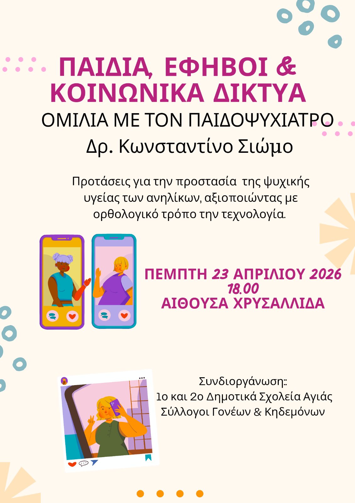 Οι Σύλλογοι Γονέων και Κηδεμόνων του 1ου και 2ου Δημοτικού Σχολείου Αγιάς διοργανώνουν ενημερωτική εκδήλωση, την Πέμπτη 23 Απριλίου, στις 6:00μμ, στο Πολιτιστικό Κέντρο Αγιάς “Χρυσαλλίδα”, όπου ο παιδοψυχίατρος Δρ. Κωνσταντίνος Σιώμος θα αναπτύξει το θέμα “Παιδιά, έφηβοι και κοινωνικά δίκτυα”. Θα ακουστούν προτάσεις για την προστασία της ψυχικής υγείας των ανηλίκων, αξιοποιώντας με ορθολογικό τρόπο την τεχνολογία.