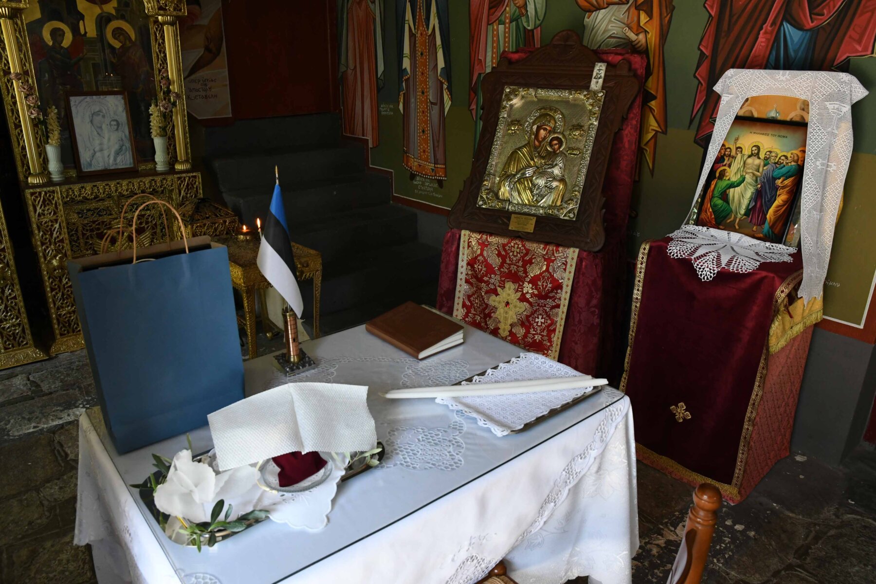 Ο ίδιος με εμφανή χαρά στο πρόσωπό του συνομίλησε για ώρα με τον Πρόεδρο της πατρίδας του, αναφέρθηκε στο πως είναι η ζωή τους εδώ, και τον ξενάγησε στον ναό των Αγίων 12 Αποστόλων.