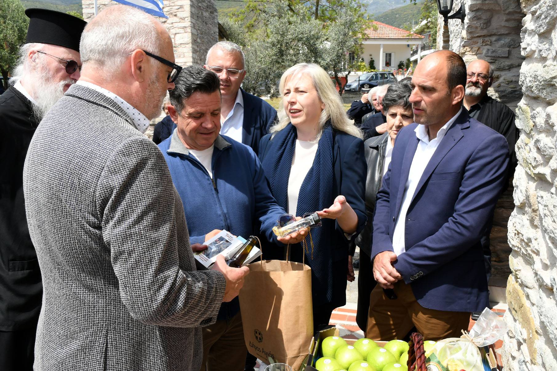 Λόγω απουσίας στις Βρυξέλλες του δημάρχου Αγιάς Αντώνη Γκουντάρα, την εκπροσώπηση στην υποδοχή ανέλαβαν ο πρόεδρος του Δημοτικού Συμβουλίου Παντελής Χατζηρούφας και ο αντιδήμαρχος Παιδείας, Αθλητισμού, Νεολαίας, Εθελοντισμού και Πολιτισμού Ευάγγελος Κρανιώτης. Ο κ. Κρανιώτης καλωσόρισε τον Εσθονό Πρόεδρο στην περιοχή, του ευχήθηκε να χαρεί τις συναντήσεις του και τη σχεδόν μονοήμερη παρουσία του σε Νερόμυλους, Μεταξοχώρι και Ανατολή, και τον προσκάλεσε να επανέλθει και να χαρεί την φιλοξενία όλου του Δήμου Αγιάς προσφέροντάς του παράλληλα τοπικά προϊόντα και βιβλία με αναφορές στην τοπική ιστορία.