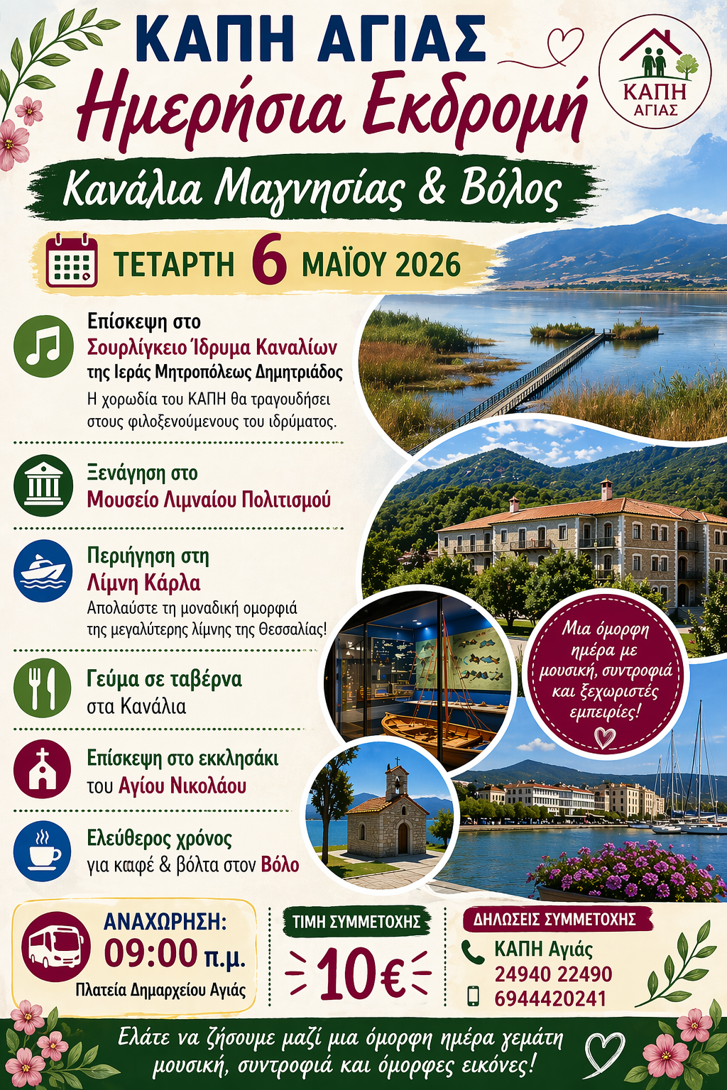 Ο Δήμος Αγιάς και η Διεύθυνση Κοινωνικής Πρόνοιας, Παιδείας, Πολιτισμού, Αθλητισμού κι Εξυπηρέτησης του Πολίτη προγραμματίζουν για το ΚΑΠΗ Αγιάς ημερήσια εκδρομή στα Κανάλια Μαγνησίας και στον Βόλο, την Τετάρτη 6 Μαΐου.