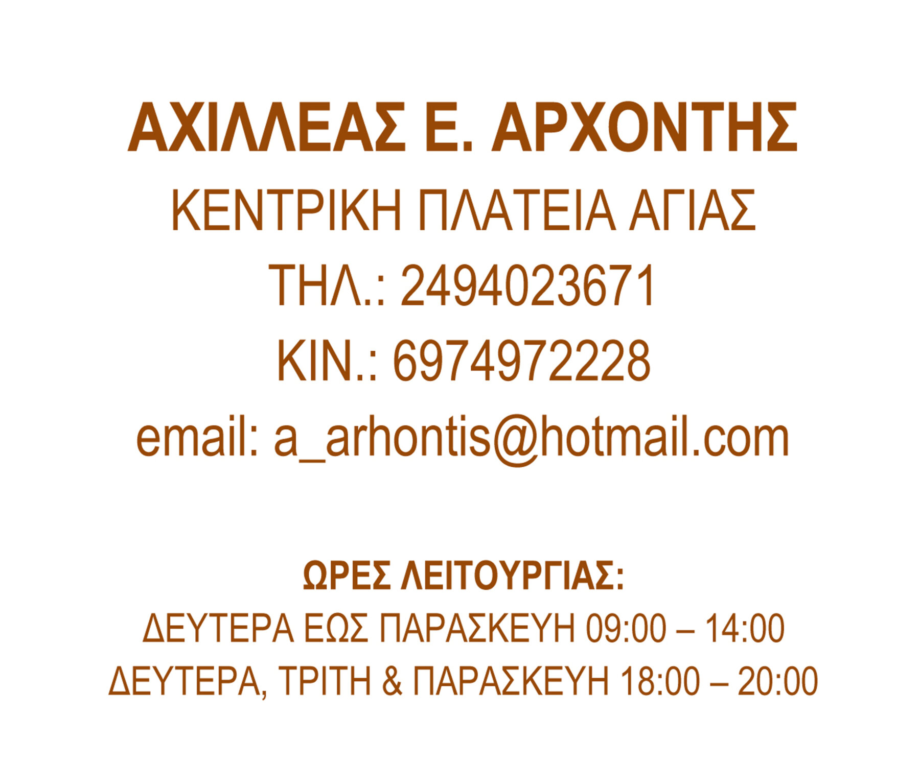 Το πρώτο ιδιωτικό ΚΕΠ στην Αγιά είναι πραγματικότητα… Με την πολυετή εμπειρία στα λογιστικά του οικονομολόγου Αχιλλέα Ε. Αρχοντή, αυτός και οι άψογα καταρτισμένοι συνεργάτες του εγγυούνται την σωστή και γρήγορη διεκπεραίωση συναλλαγών του πολίτη με το δημόσιο παρέχοντας τις εξής υπηρεσίες: