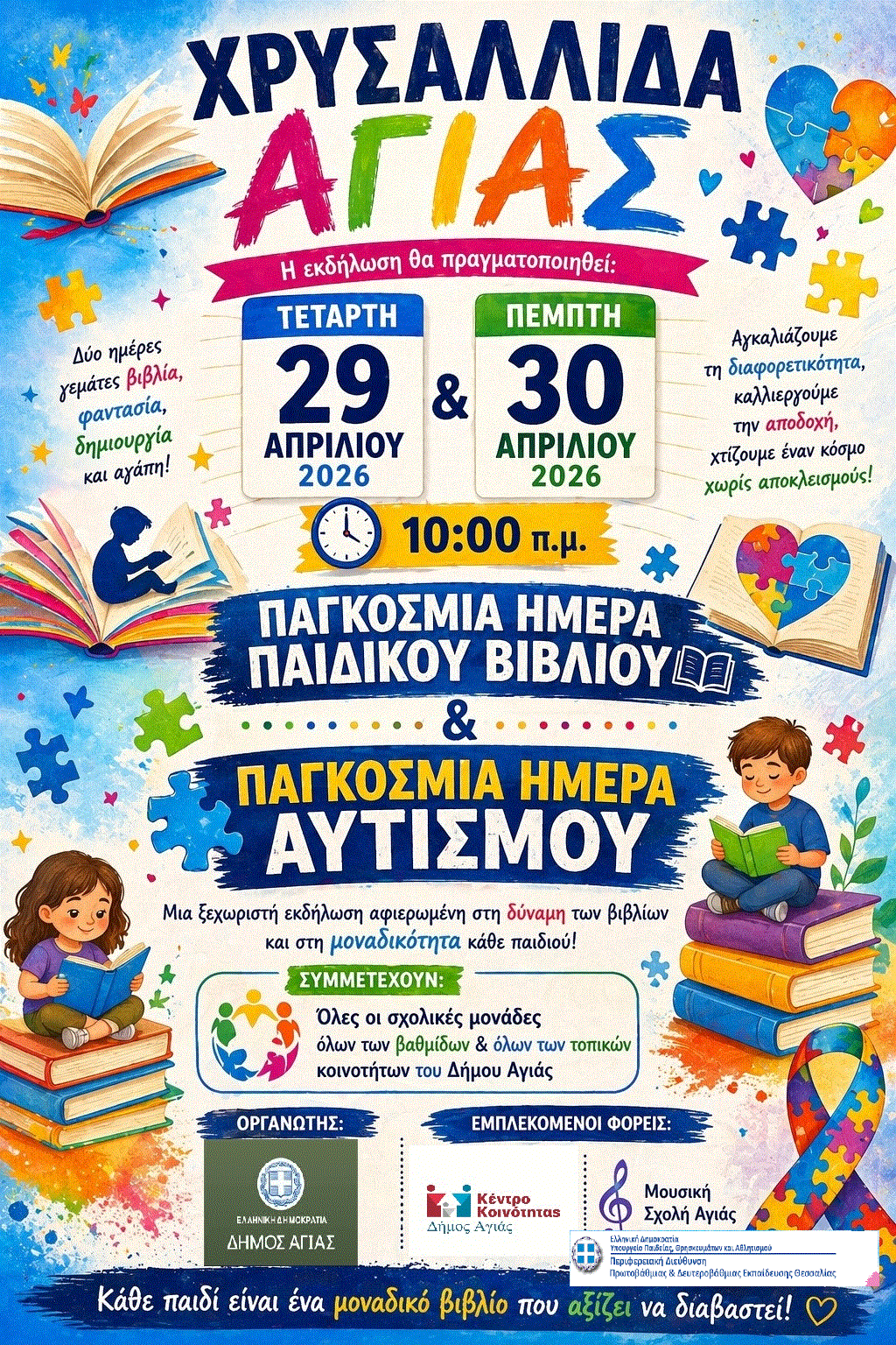 Μια ξεχωριστή εκπαιδευτική και κοινωνική δράση με έντονο συμβολισμό διοργανώνει ο Δήμος Αγιάς και η Διεύθυνση Κοινωνικής Πρόνοιας, Παιδείας, Πολιτισμού, Αθλητισμού κι Εξυπηρέτησης του Πολίτη, σε συνεργασία με τη Περιφερειακή Διεύθυνση Εκπαίδευσης Θεσσαλίας, με αφορμή την Παγκόσμια Ημέρα Παιδικού Βιβλίου και την Παγκόσμια Ημέρα Αυτισμού(2 Απριλίου).