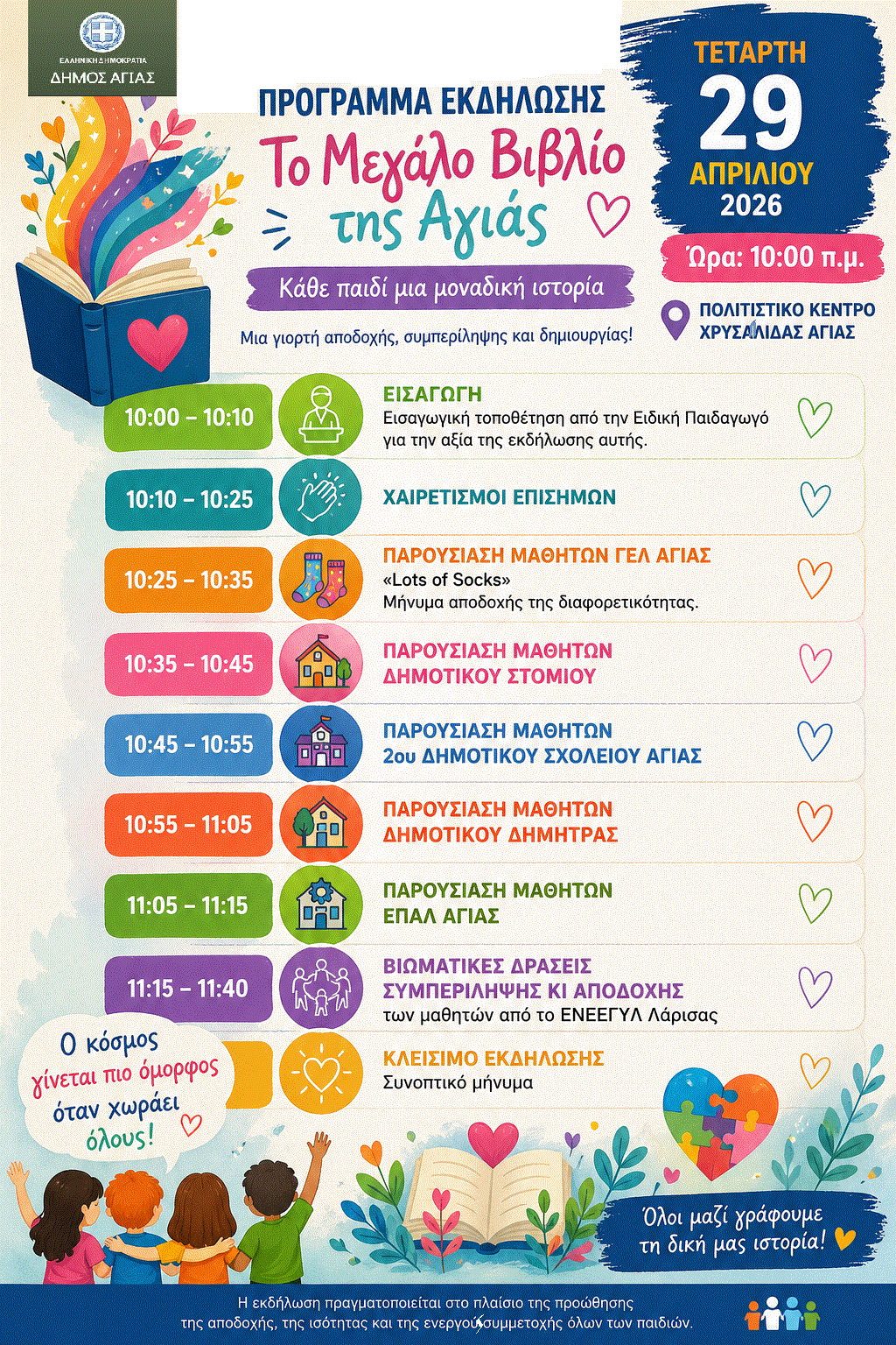 Την Τετάρτη 29 και την Πέμπτη 30 Απριλίου, στις 10:00πμ, στο Πολιτιστικό Κέντρο Αγιάς “Χρυσαλλίδα”, μαθητές από όλες τις σχολικές μονάδες των τοπικών κοινοτήτων του Δήμου θα συμμετάσχουν στην εκδήλωση με τίτλο: “Το Μεγάλο Βιβλίο της Αγιάς – Όλοι διαφορετικοί, Όλοι φίλοι”.